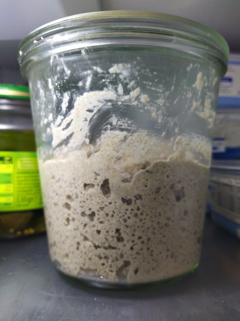 Mein Brot fängt mit Sauerteig an. Mit Hefeteig (Pizzaaaaa) hatte ich schon viel Erfahrungen gemacht über die Jahre, Sauerteig war neu für mich. Aus Kindheitserinnerungen habe ich das selbstgebackene Roggenbrot meiner Mutter als eher ungenießbar in Erinnerung. Mit der Zeit, sich intensiver damit zu befassen und der Neugier, ob sich die Erfahrung wiederholen würde, habe ich also einen Sauerteig angesetzt im letzten Sommer, als es sehr warm war. Roggenmehl und Wasser, und sonst nichts. Bei 25°C – 30°C. Jeden Tag Füttern mit 50g Mehl und 50g Wasser. Es hat funktioniert, und nach 5 Tagen hatte ich eine klebrige und säuerlich riechende Pampe im Einmachglas, die ich seitdem weitergezogen habe. Die Pflege ist jetzt eigentlich ganz einfach: